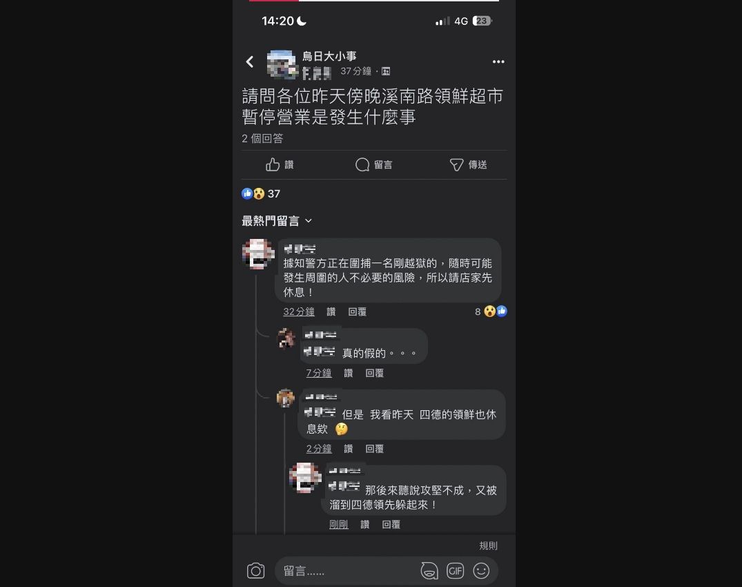 ▲網驚傳警追捕逃獄犯,要求超市緊急閉店。(圖/翻攝烏日大小事)