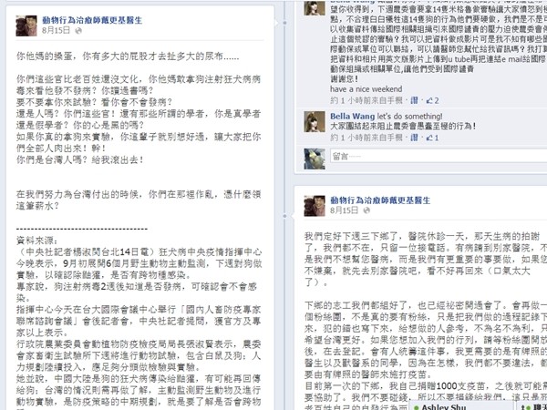 戴更基向來敢怒敢言,這次臉書怒批官員、學者是真學者還是假學者?心是黑的嗎?17日下午他發文進一步表示,有人認為實驗有其必要性,才能知道狗染病多久會發病,但醫界早已有研究,犬隻染病潛伏期約3到8周。過去已有動物實驗,也藉此發展出疫苗,且疫苗發展已相當成熟,為何這次還非得進行試驗?病指出這項的行為是「打著『拯救人類』的旗號做著無知的事情而已」。