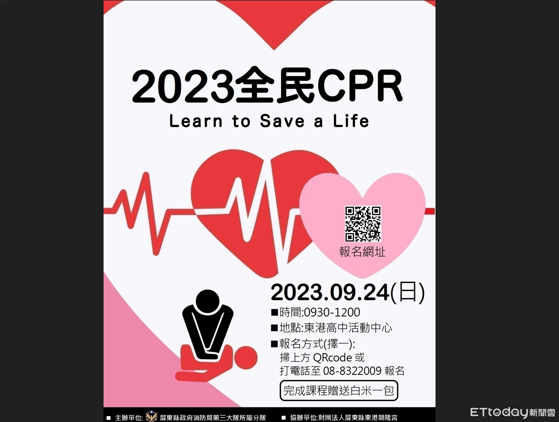 屏東縣政府消防局為推廣民眾急救意識與技能,於9月24日上午在屏東縣東港高中活動中心辦理「全民CPR暨防火宣導」活動,邀請縣民參與體驗學習,活動內容為「心肺復甦術(CPR)」與「自動體外心臟電擊去顫器(AED)」的操作與技巧,期許縣民都能具備急救技能,在意外事故發生的關鍵時刻能夠緊急應變救人一命,完成全程訓練課程者致贈一包白米。
