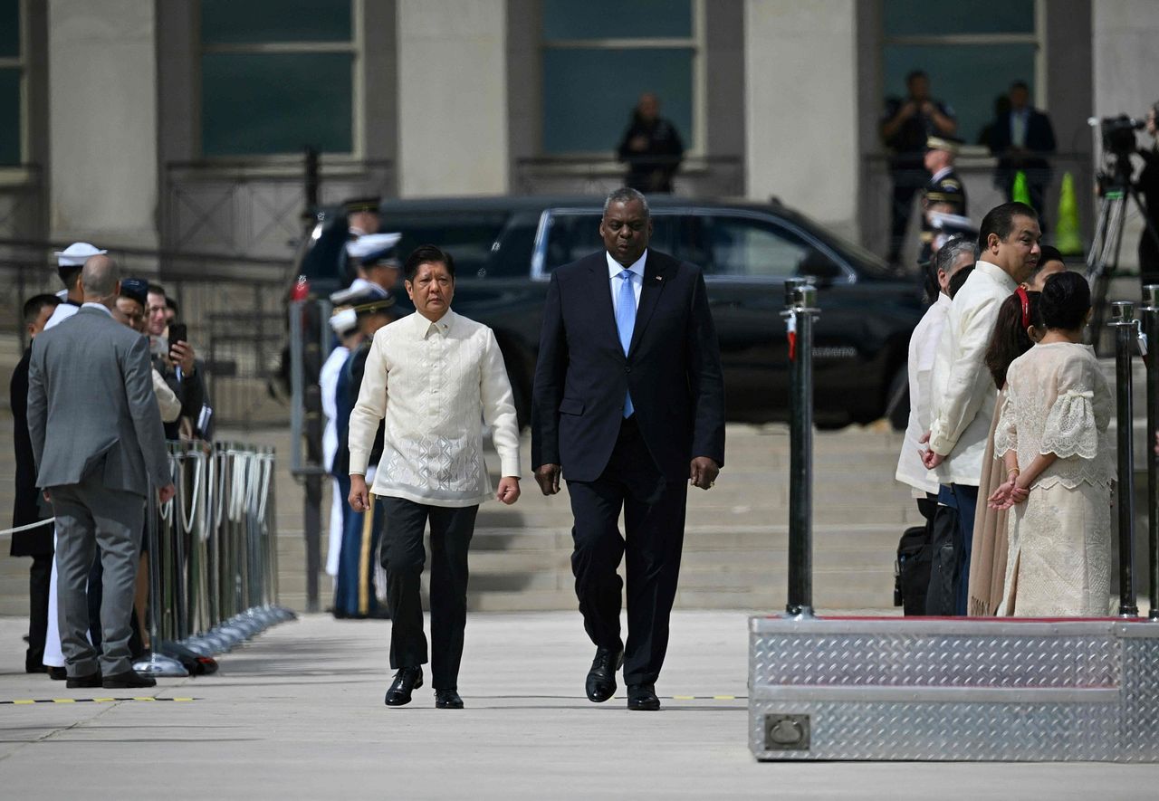 ▲美國國防部長奧斯汀5月在五角大廈與菲律賓總統小馬可仕見面。(示意圖/CFP)