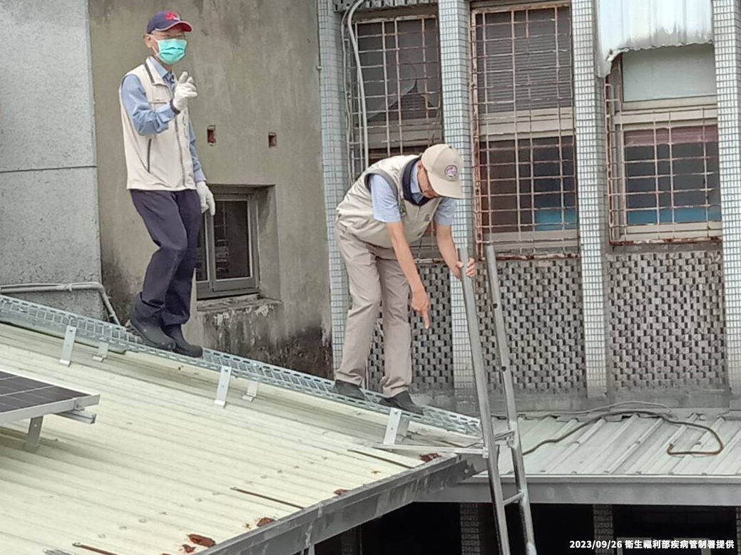 ▲羅一鈞(右)至台南協助登革熱防治,因爬上屋頂未戴安全帽引來立委關心。(圖/疾管署提供)
