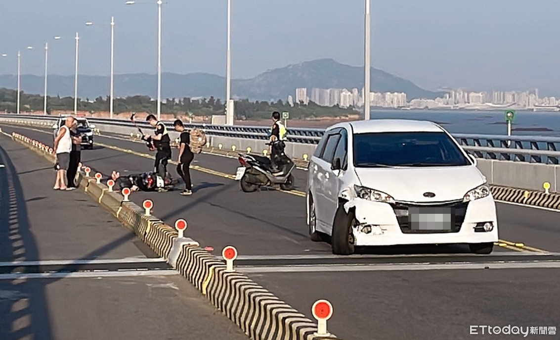 金門縣金門大橋烈嶼端路段,今(2)日清晨6時25分許發生一起追撞交通事故,張姓女駕駛疑因日出太陽刺眼,於橋上追撞同向右前方林姓女騎士,另名王姓男騎士也疑因太陽刺眼追撞已倒地機車,詳細肇事原因由金城分局釐清中。