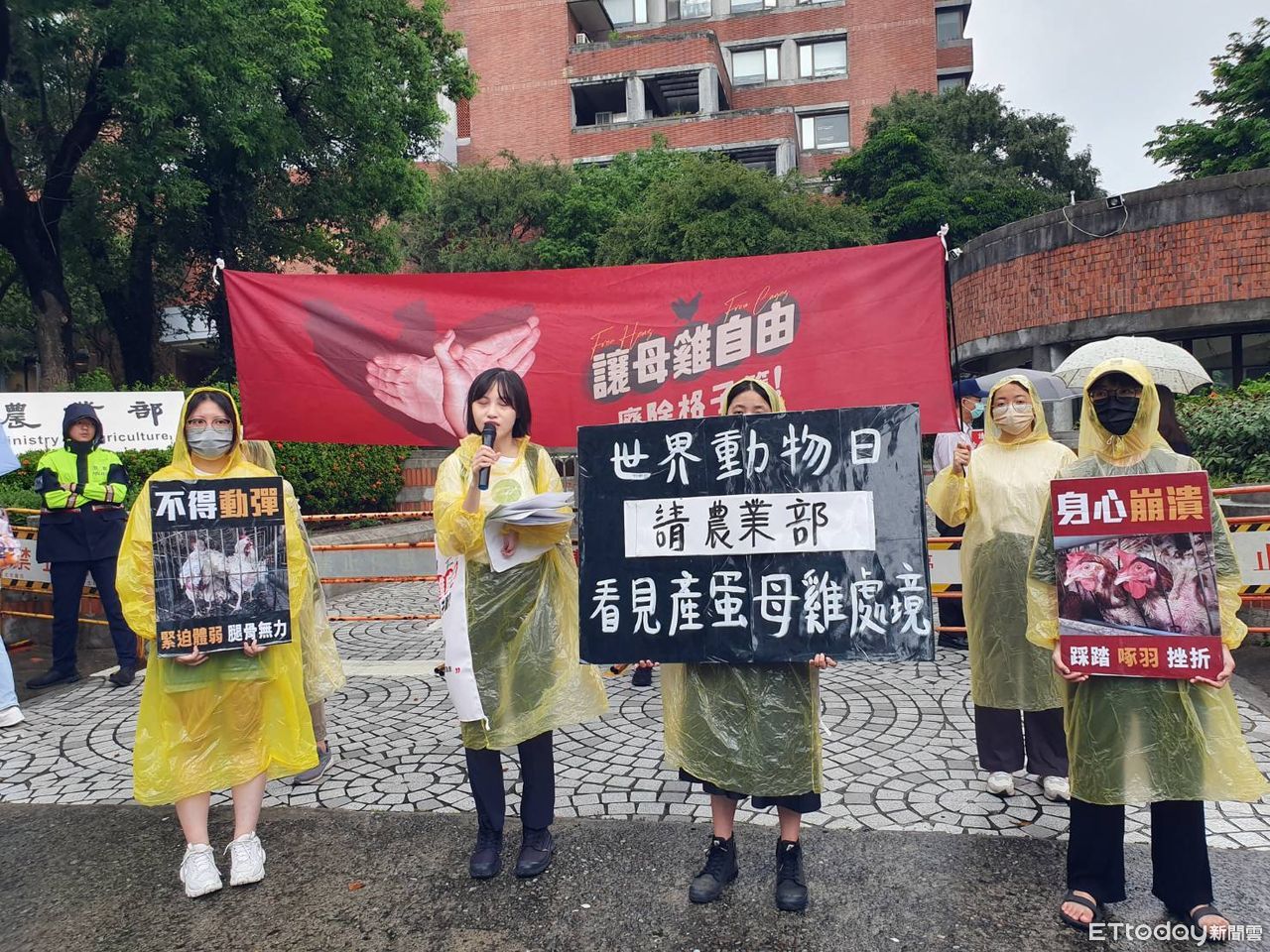 今天是「世界動物日」,台灣動物社會研究會上午前往農業部、總統府、立法院進行快閃活動,舉牌訴求「讓母雞自由,廢除格子籠」,認為台灣在養母雞高達4500萬隻,產蛋率卻只有5成多,「雞越養越多,蛋依舊不足」,要求政府制定具體政策,逐步讓「格子籠」飼養系統退場, 跟上國際動物福利趨勢,也確保國人飲食健康。