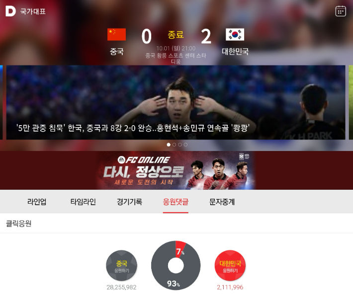 在男子足球八強賽南韓隊對上中國隊期間,由南韓Daum所主辦的點擊應援活動上,為中國加油的點擊次數竟然高達2825萬5982次,遠遠勝過為南韓隊加油的211萬1996次,等於為中國隊加油的比率高達93%,然而為南韓隊加油的比率卻只佔7%。