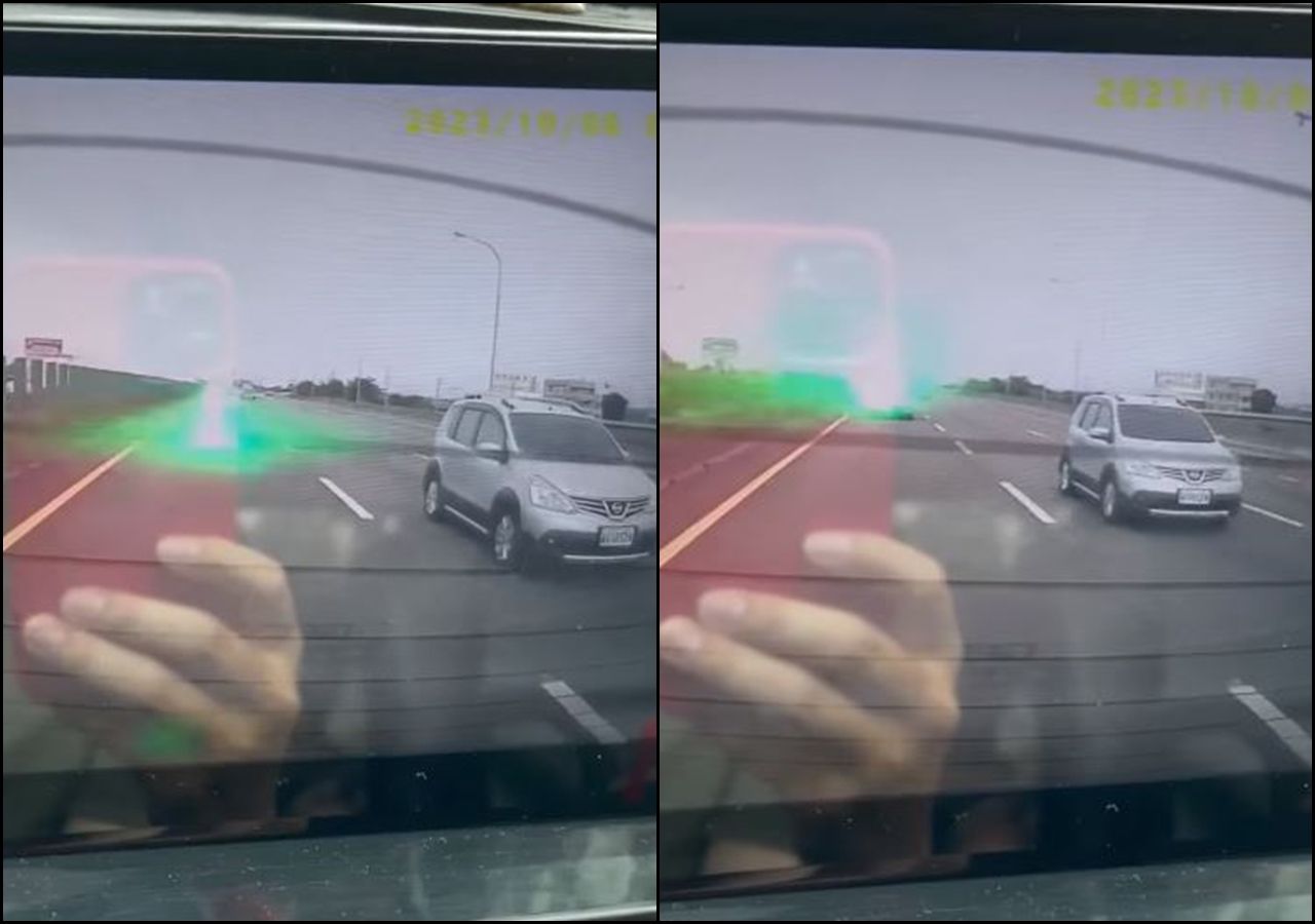臉書粉絲團「八卦村-行車紀錄器影片上傳中心」6日貼出該影片,可以看見駕駛行駛在某國道的內車道,從旁邊有車輛被超車的場面來看,他的車速顯然不慢,然而他仍遭後方車輛拿雷射筆照射,4秒內閃了2次,讓他非常不滿。