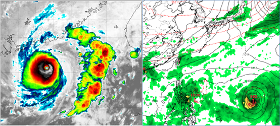 ▲左圖:7日2時紅外線雲圖顯示,「中颱小犬」仍有清晰的颱風眼。右圖:國慶日為東北風型態,迎風面水氣多。兩熱帶擾動一在關島附近,另一在呂宋島東側。(圖/三立準氣象.老大洩天機)