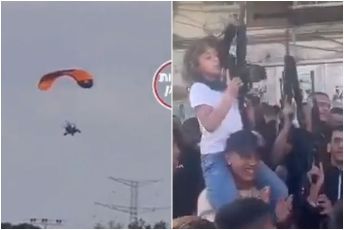 巴勒斯坦激進組織「哈瑪斯」(Hamas)7日對以色列發動軍事突襲,透過滑翔傘、船隻、徒步的海陸空三種方式進入以色列境內。依據影片,哈瑪斯的卡薩姆旅(Al Qassam Brigades)成員穿越建築密集地區開火,在此之際,約旦河西岸(West Bank)的巴勒斯坦人正為此慶祝,群眾聚集在一起高聲喊口號,對空鳴槍。