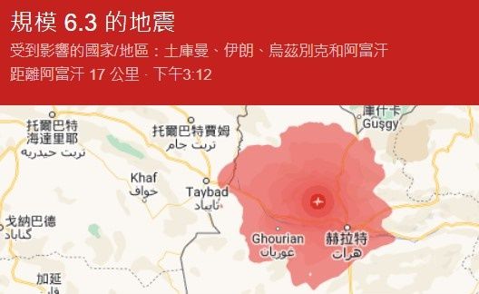 美國地質調查所(USGS)稍早的數據指出,阿富汗西部地區今天上午發生規模6.3強震,震央位於赫拉特市西北方40公里處,震源深度僅有14公里,且之後當地又發生多起餘震。