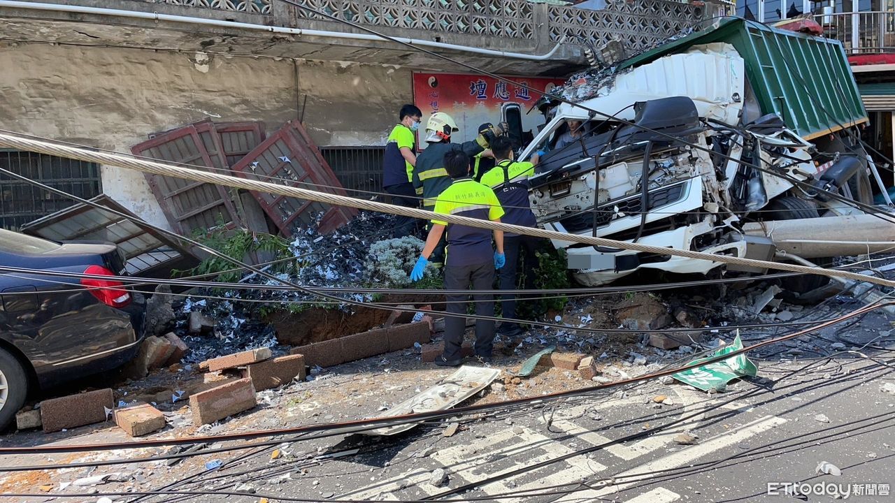 ▲卡車失控撞向路邊,意外波及電線桿。 (記者陳凱力翻攝,下同)