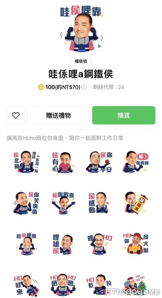 另外,「哇係哩a鋼鐵侯」這款貼圖,設計師來自侯友宜競選辦公室。設計師楊依依表示,侯友宜過去當警察保護人民,捍衛人民安全的形象深植國人心中,對許多國人而言侯市長是超級英雄,就像鋼鐵人能保護人民安全,更能守護我們的國家。