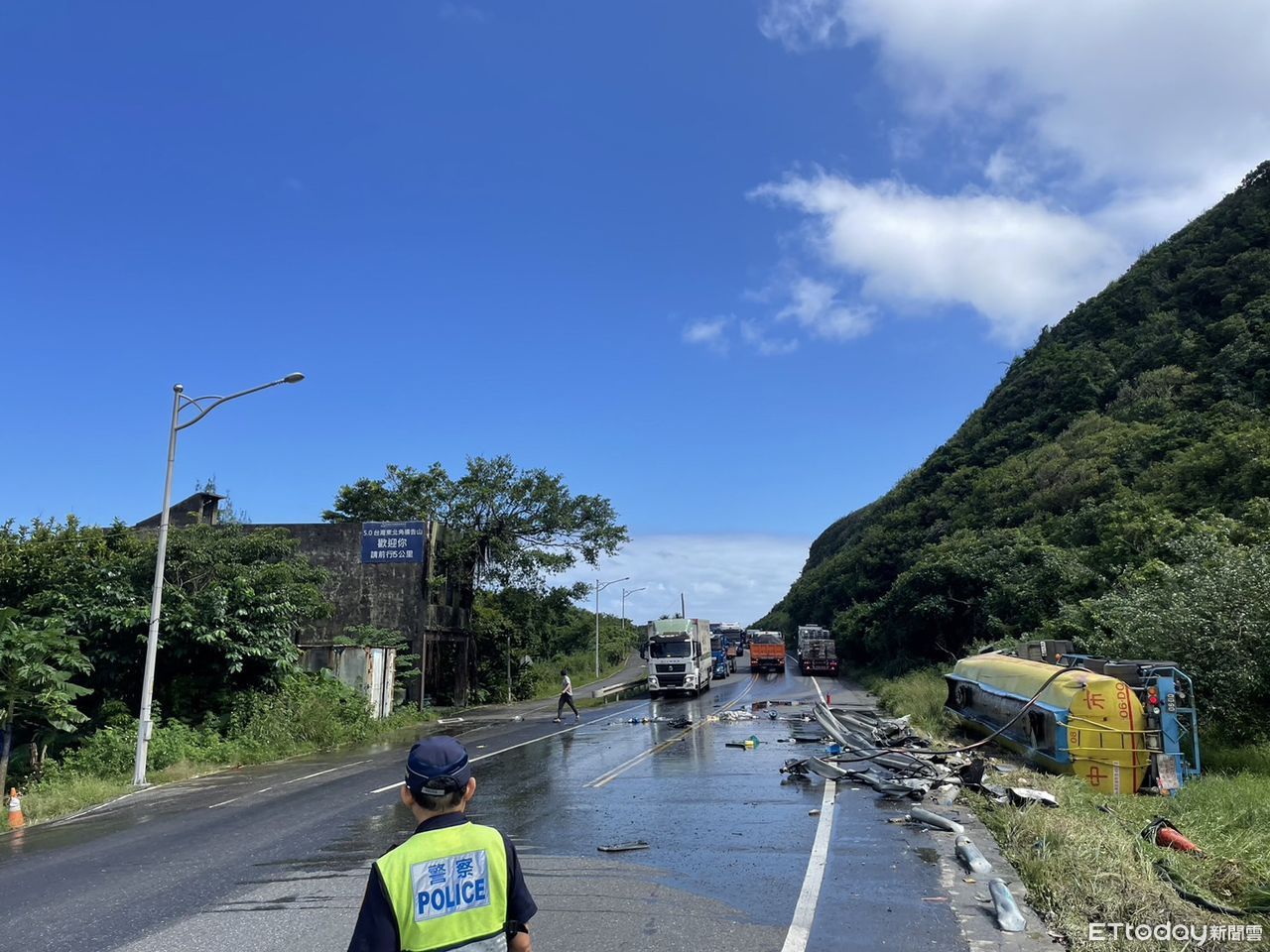 ▲ 台2線化學槽車翻覆,現場疑有毒物外洩造成異味瀰漫 駕駛卡車內無生命徵象。(圖/記者郭世賢翻攝)