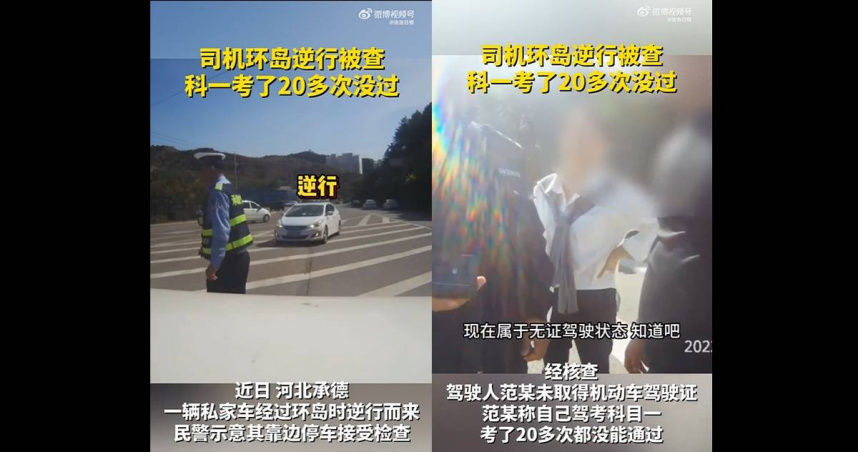 根據中國媒體報導,中國河北交通警察在值勤時,發現一輛白車逆向行駛在道路上,交警立即示意車主停靠至路邊,調查後發現該名范姓駕駛沒有汽車駕照,這已經是他第三次無照被抓,是個違規慣犯。男子透露自己考了20次都沒通過,還停留在科目一的理論考試,交警聽完後,無奈回:「要不然你怎麼過不了呢?你連那些交通號誌都看不清楚了。」而後,公安部交通管理局針對范姓男子,無照駕駛和逆向行駛的違法行為進行懲處。