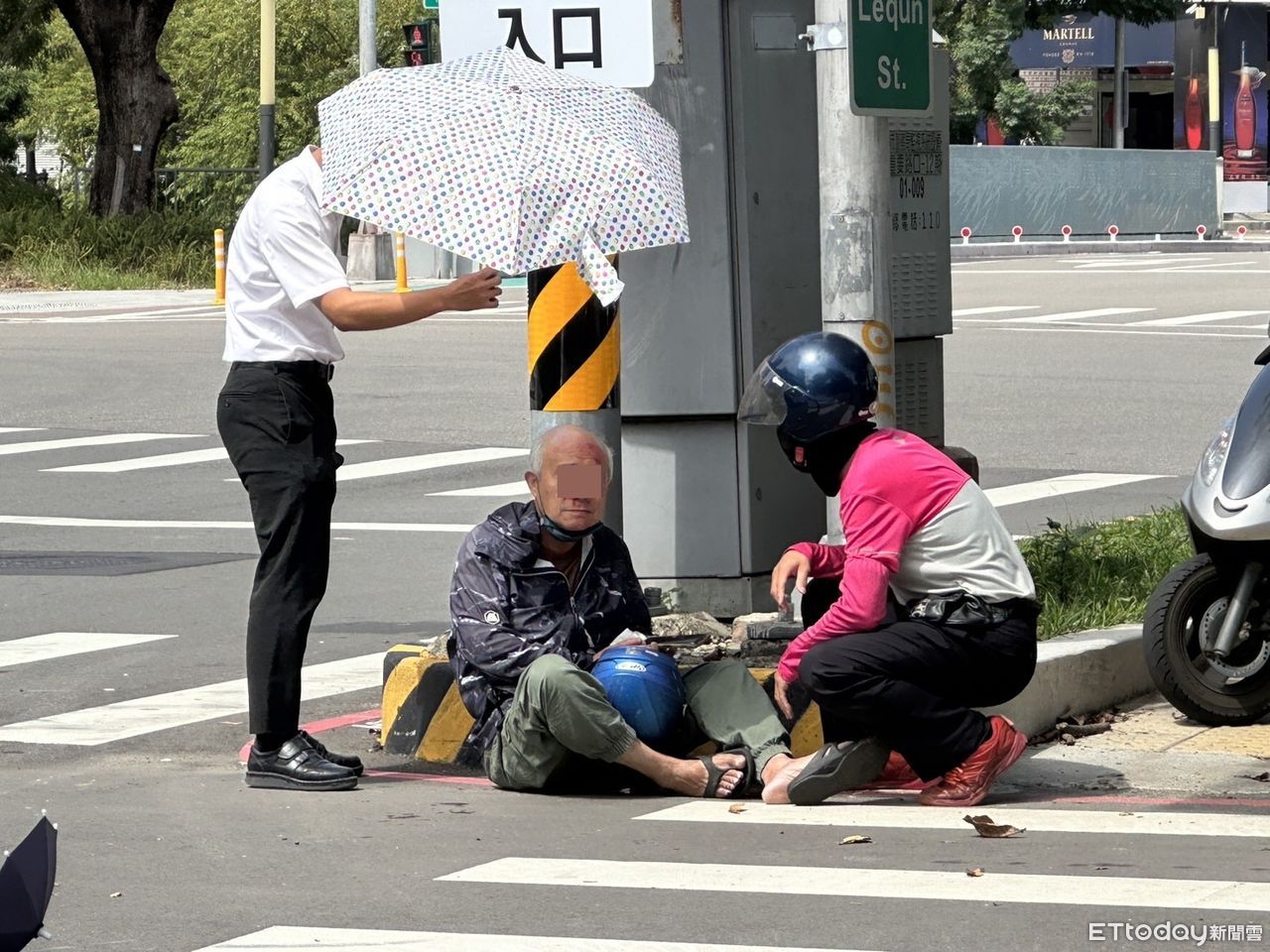 ▲外送員白髮蒼蒼,車禍倒地後有民眾主動撐傘遮陽,也有其他外送員上前關心。(圖/記者許權毅攝)