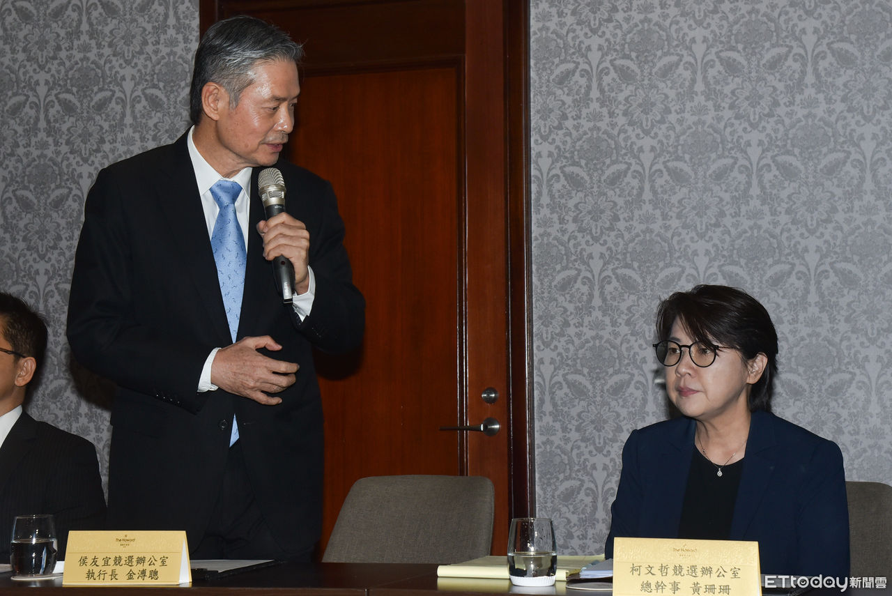 ▲藍白合會後金溥聰與黃珊珊一同出面說明會議初步結論。(圖/記者李毓康攝)