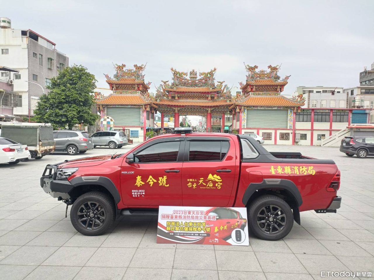 天后宮董事長林有德表示,愛心皮卡車消防救災車輛由台東天后宮與賴文泰先生、蕭惠今女士伉儷共同捐贈,定名為【台東天后宮暨泰今號】,台東天后宮是清朝以來東台灣唯一媽祖「官廟」,是東台灣民間宗教信仰中心,依循天上聖母慈暉普照、博愛眾生精神,平常捐助幫忙有需要單位與團體及弱勢族群。2019年已捐贈消防局救護車一部,今天再次捐贈消防救災車輛一部,感謝共同捐助人賴文泰先生伉儷共襄盛舉。