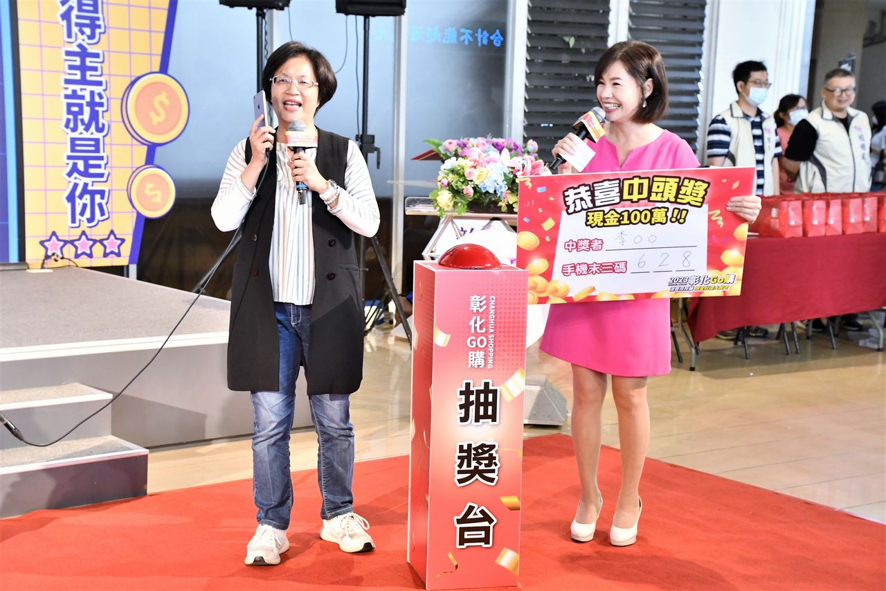 「2023彰化GO購」消費抽獎活動,提供1萬多個獎項,消費飆破10億元,今(16)日上午舉行第3次直播抽獎,在律師陳振吉見證下,抽出頭獎最大獎現金100萬元,得獎者是和美鎮李先生,在全聯消費486元,登錄抽中,縣長王惠美親自打電話致賀時,他剛開始還不可置信,接著才開心的直喊「謝謝」、「怎麼給」。