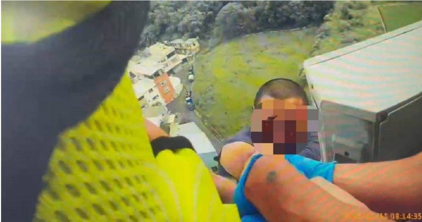 朝山派出所警員與消防人員火速趕抵香山區中華路六段的一處大樓,但因屋內反鎖只好破門救人,2名員警先是伸手抓住蔡男手臂,緊接著消防人員爬上陽台抓住蔡男腰帶,警消4人費了好大一番功夫,才終於將蔡男順利救下,避免了一場可怕的悲劇發生。