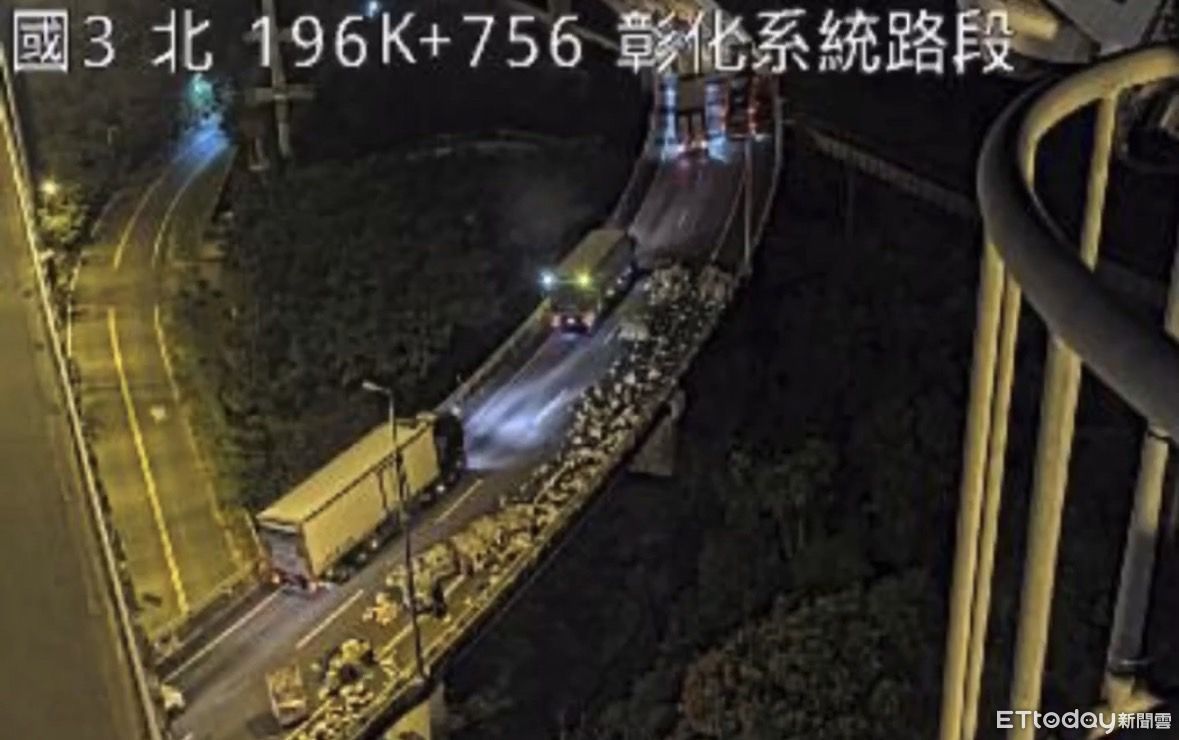 國道1號彰化段連接國道3號的匝道,昨(16)日晚間9時許,一輛載運購物網站貨物的聯結車發生貨物掉落,貨物佔據外線車道,僅剩內側車道讓車輛通行;事故於同晚10時許排除,警方除依法製單舉發該車駕駛,也將釐清貨品掉落原因,調查是否涉及公共危險罪嫌。