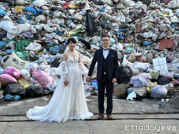 ▲關心環保議題的新人在埔里鎮垃圾山前拍婚紗。(圖/翻攝自「南投縣埔里鎮清潔隊」臉書粉專)