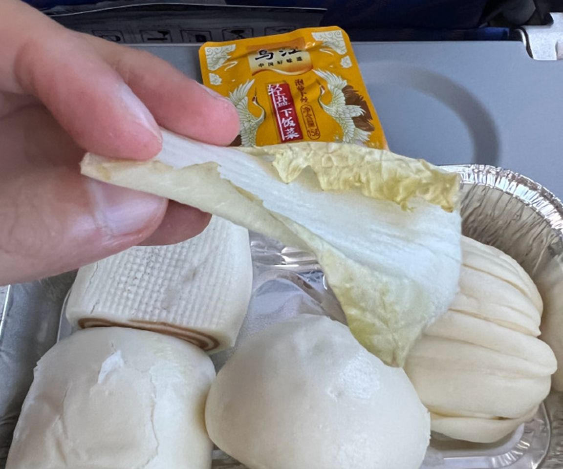 ▲他坐飛機驚見飛機餐只有4饅頭+榨菜白菜,直呼人生多年還是第一次看見。(圖/翻攝自微博)