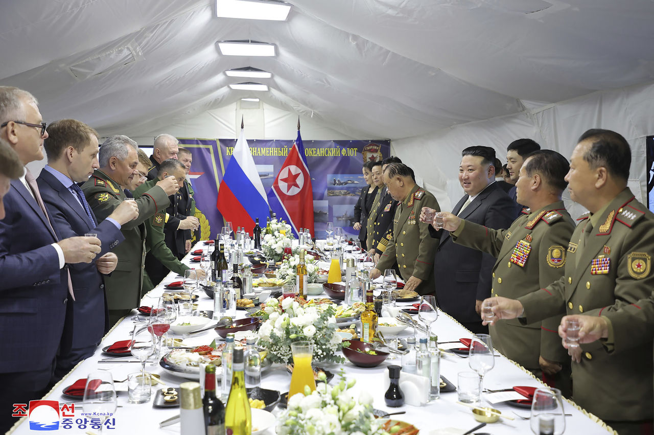 ▲9月16日,金正恩在訪俄之旅中,向俄羅斯國防部長蕭伊古敬酒。(圖/達志影像/美聯社)