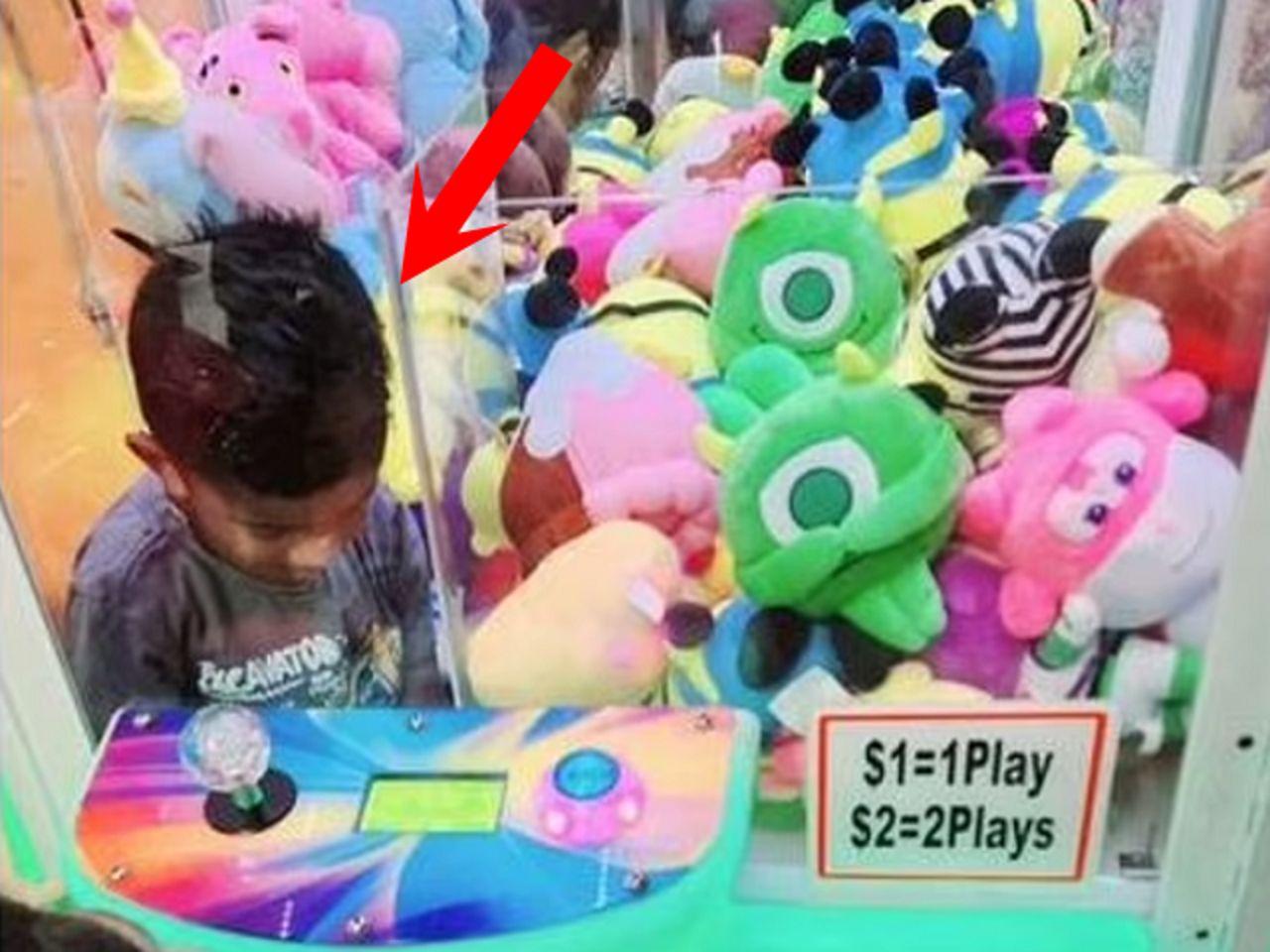 ▲夾娃娃機裡有真娃娃!男童為了小小兵鑽進去,絨毛玩偶「探出人頭」嚇壞家長。(翻自《每日郵報》)