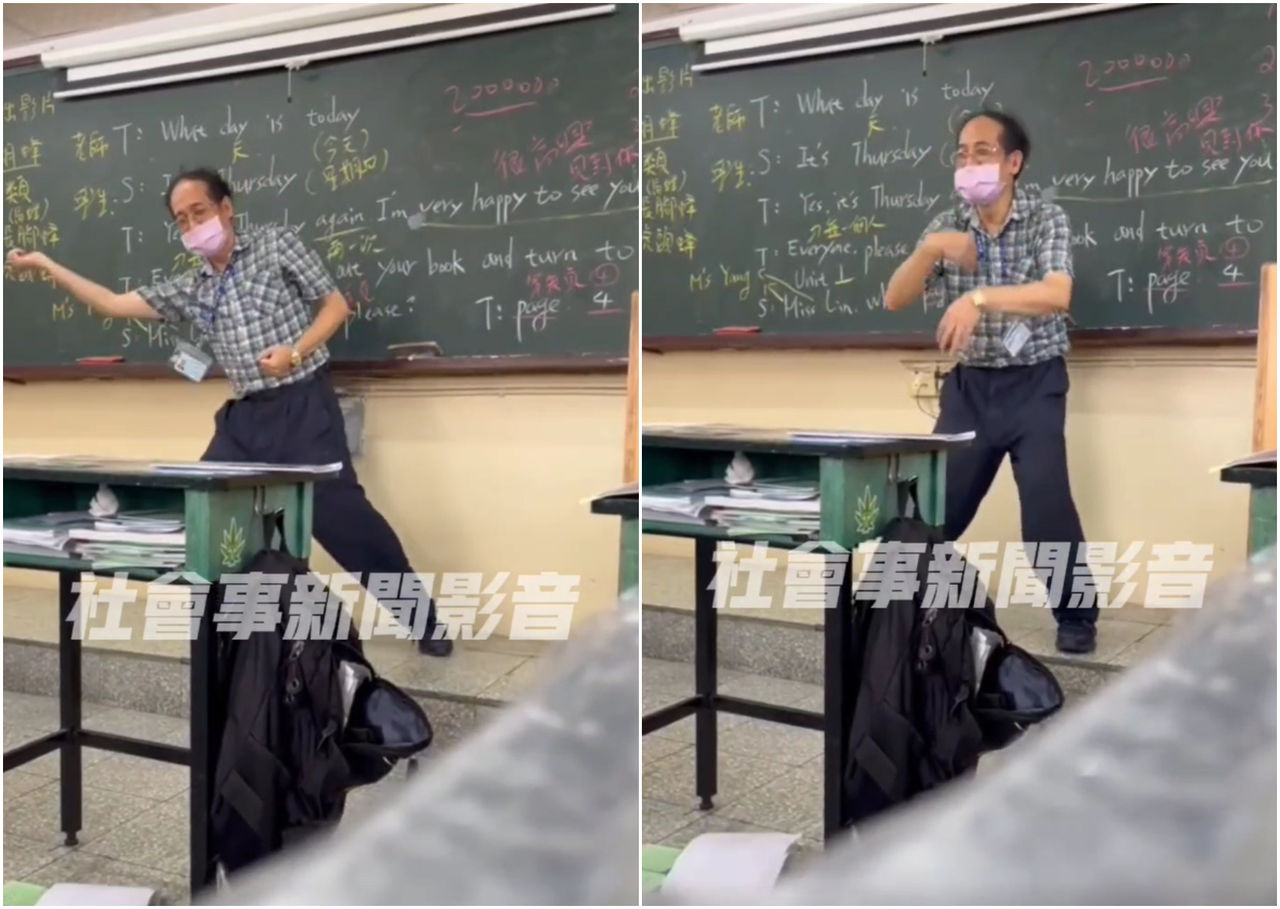「社會事新聞影音」轉傳影片,看到黑板上寫了滿滿的英文句型,且上面還有講解的字句,不過台上帶著眼鏡、身穿格紋短袖的男老師,卻不是繼續趕新的進度,而是在台上賣力帶動跳,搭配歡樂的配樂,從左邊跳到右邊,雖然肢體有點僵硬,但還是讓學生看得非常開心,看得出來老師使盡全力吸引注意。