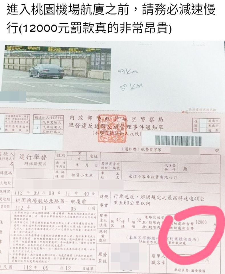 據指出,有租賃業者收到航警局寄發的違規超速照相罰單,金額高達12,000元,地點就在桃園國際機場第一航廈附近,有網友質疑真實性,但一張罰單相片卻說明一切,照片中的租賃車被拍到時速93公里,超過機場限速50公里上限多達43公里之多。