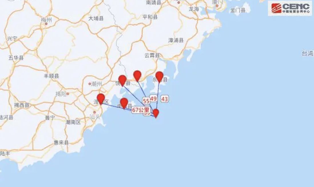 數據顯示,這起地震震央距南澳縣39公里、距福建東山縣43公里、距福建詔安縣49公里、距饒平縣55公里、距澄海區67公里,距汕頭市72公里。震央周邊200公里內近5年來發生規模3以上地震共23次,最大一起是發生在2018年11月26日於台灣海峽發生的規模6.2地震(距離本次震央124公里)。