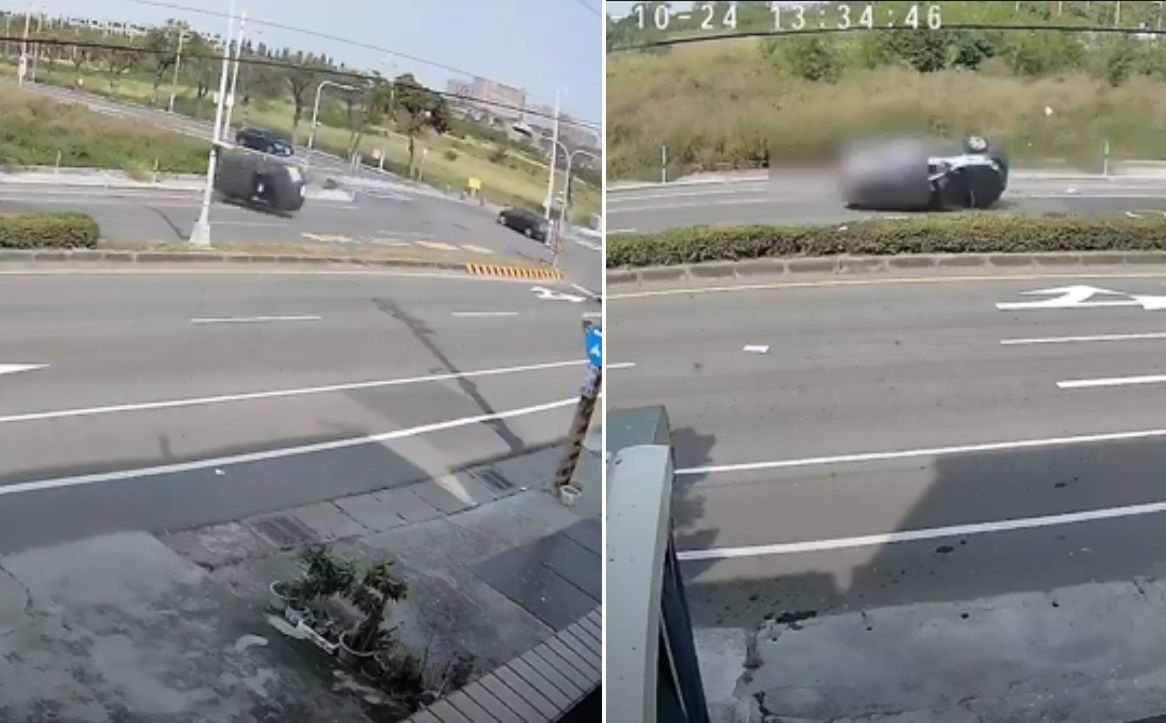 根據監視器畫面,當時黑色休旅車直行通過事發路口,車速並不慢,不料此時有另輛黑色轎車從對向左轉,2車發生擦撞,黑色休旅車隨即失控,並在一陣刺耳輪胎摩擦聲後,連續翻滾2圈並滑行大段距離,駕駛則是當場被拋飛車外,景象怵目驚心。