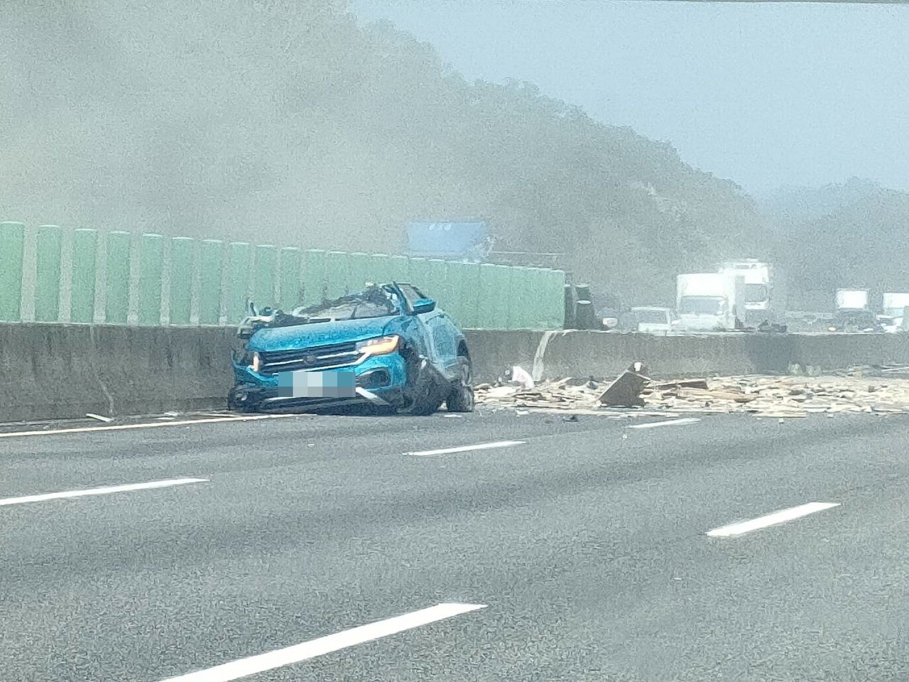 國道3號南下142公里處通霄路段今(26)日中午12時許發生車禍!1輛大貨車與藍色自小客車不明原因碰撞後,自小客失控衝到對向車道,路中央一整排防眩板被撞斷,右側車身則是上下擠壓變形,警消獲報到場處理中,目前封閉南北向內2車道處理中,各出現回堵1公里情況,詳細傷亡、肇事原因還有待進一步釐清,請用路人小心行駛。