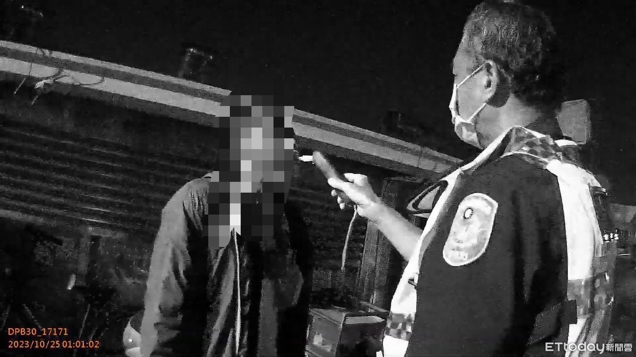 ▲台南市保安警察大隊第一中隊周姓、楊姓員警,25日凌晨在新營區查獲1名未戴安全帽的江姓男子,酒測值竟高達0.83MG/L,全案依公共危險罪嫌送辦。(圖/記者林東良翻攝,下同)