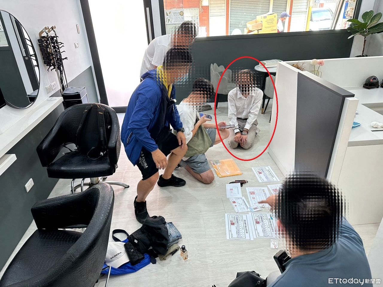 ▲詐騙集團車手(紅圈)被逮時,下跪向被害人道歉。(圖/記者唐詠絮翻攝)