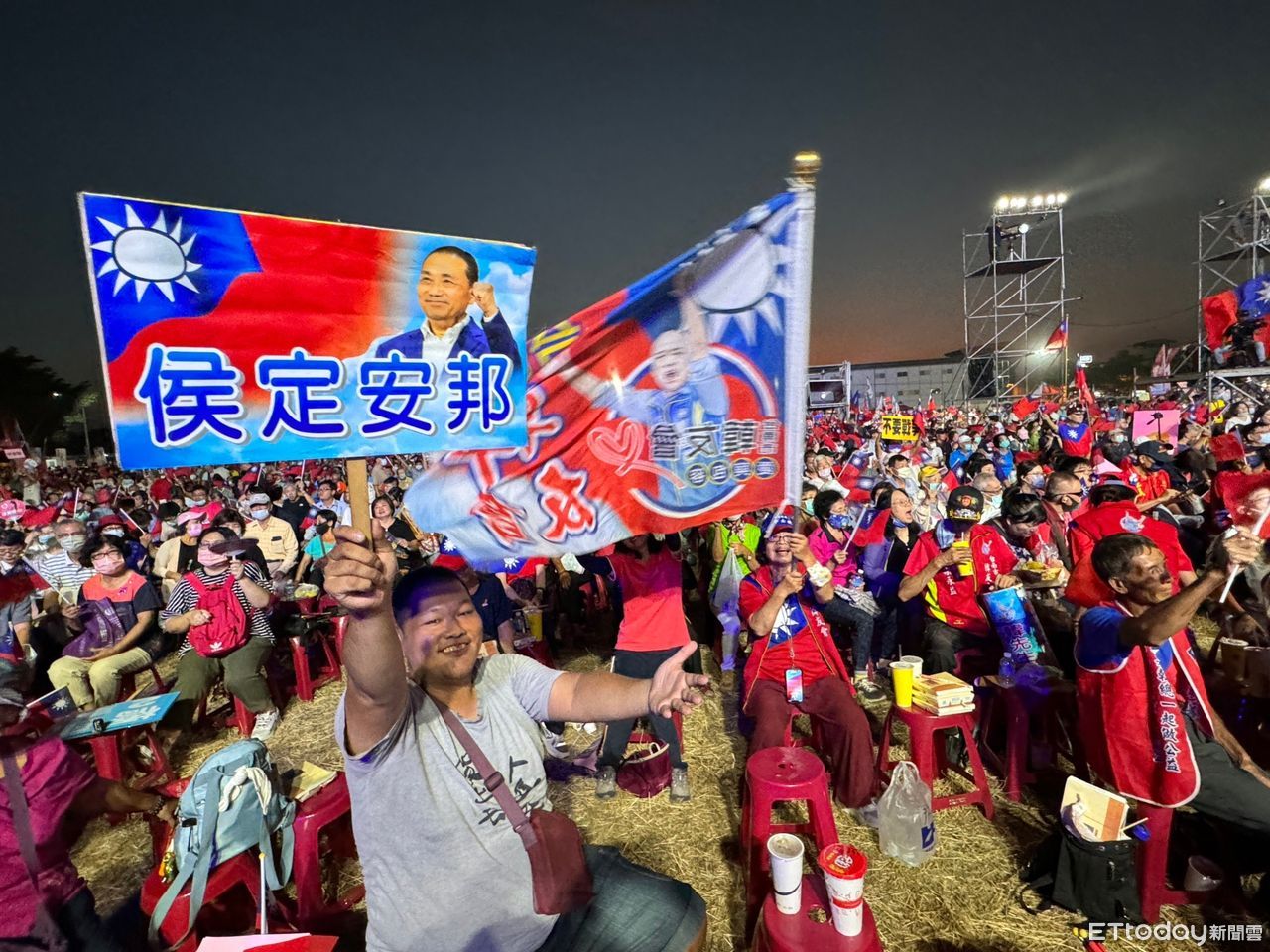 侯友宜今晚在捷運鳳山西站旁的空地,舉行高雄首場萬人造勢團結大會,下午起支持者就湧入會場,現場除了國旗飄揚,也有不少支持者拿著侯友宜的看板及國民黨立委候選人的看板揮舞支持。