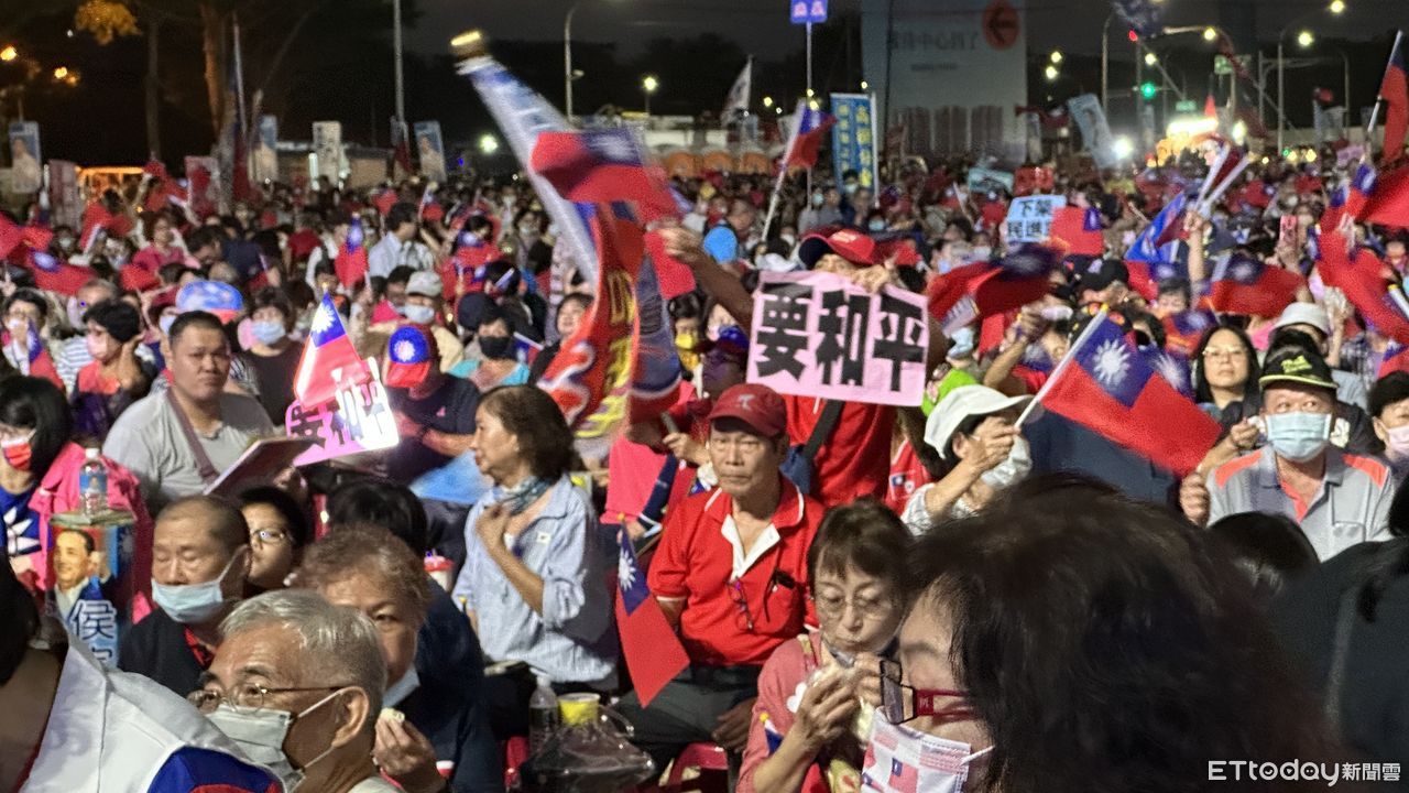 國民黨總統參選人侯友宜今(28日)晚在高雄鳳山舉辦萬人造勢晚會,不到晚間6點,支持者就擠爆活動現場,不少支持者也高舉「下架民進黨」、「不要戰爭」、「要和平」旗幟。會場周遭也有許多小攤販,販賣國旗小物。據了解,警方今晚動員約200多名警力戒備。