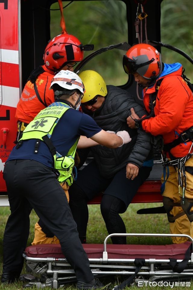 ▲黑鷹直升機搜救員吊掛出艙至地面將男子吊掛上機,飛德興棒球場,交由消防局安排救護車轉診救醫。
