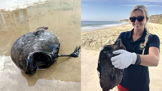 最近美國加州的海灘上出現一條「暗黑海怪」的屍體,只見該隻全身漆黑的魚屍體看起來齜牙咧嘴,不僅魚體全身漆黑、嘴巴裡長著非常鋒利的透明尖牙,甚至頭上也有一根不明條狀物。專家將檢體送交分析後,確認該隻怪魚為來自深海的相模灣鞭冠鮟鱇,是3年來第2度在該段海岸線上發現同樣物種。