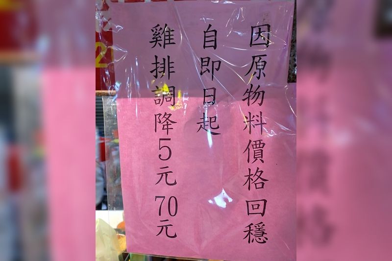 事實上,除了這間雞排店以外,先前知名的「阿亮香雞排」也曾發布公告,因為雞胸肉價格回穩,所以決定調降雞排品項的售價,10月16日開始降價為每份70元,消息瞬間讓不少網友讚翻,顯見大家都樂見店家主動降價的舉動。