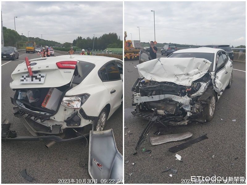 ▲白色自小客車駕駛開啟ACC功能,卻未注意車前狀況,先擦撞緩撞車再撞大貨車,駕駛受傷送醫 。(圖/記者蔡文淵翻攝)