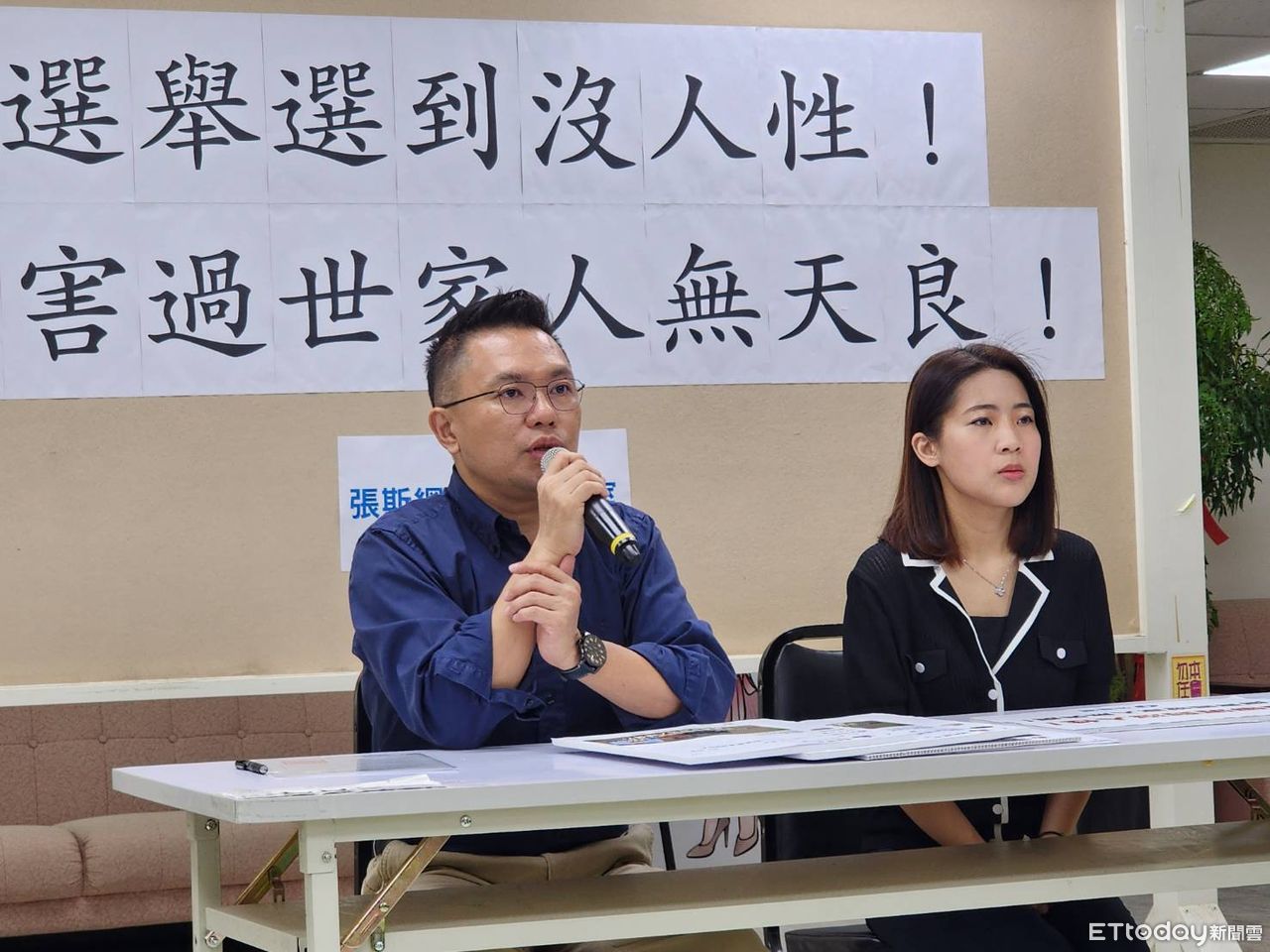 ▲國民黨台北市議員張斯綱、徐巧芯召開「選舉選到沒人性!傷害過世家人無天良!」記者會。(圖/記者陳家祥攝)