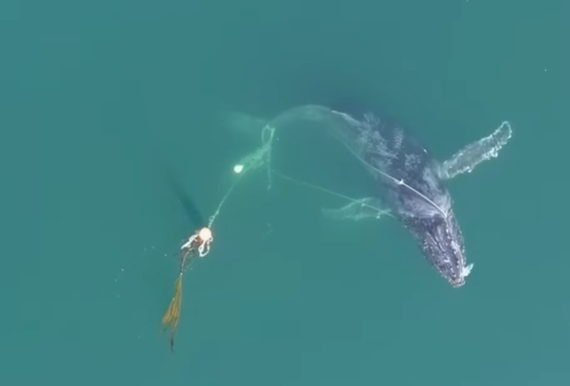 阿拉斯加附近海域日前發現一頭座頭鯨(humpback whale)身上纏繞重達300磅(約136公斤)的蟹籠及巨型繩索,導致牠只能順時針繞圈游動,受困長達3天。所幸救援人員最後幫牠將繩索切斷,成功解救這頭可憐的鯨魚。