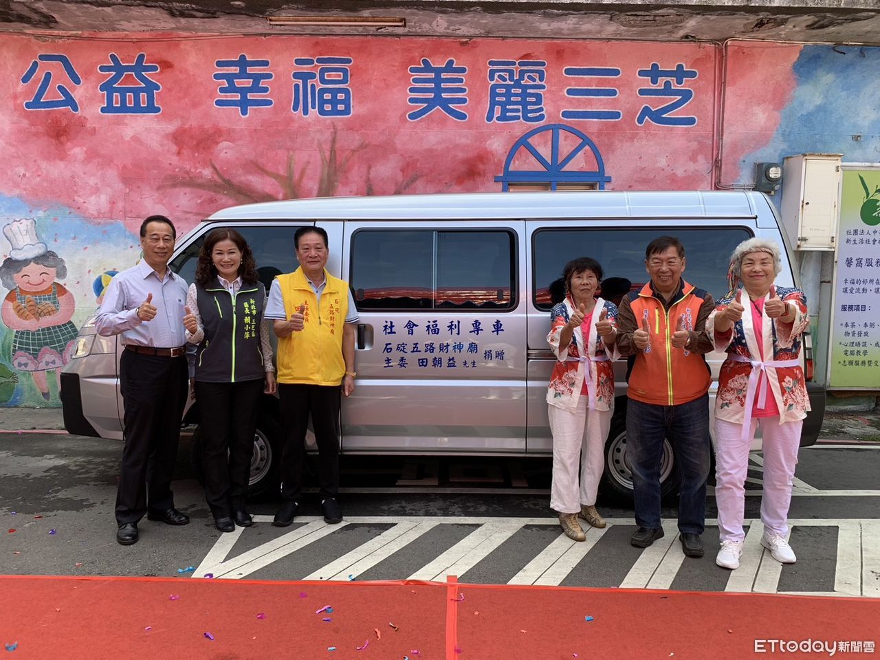 新北石碇區五路財神廟主委田朝益是土生土長三芝人,他為了造福鄉里,於昨(上月30日)在三芝區公所舉行社福專車捐贈儀式,主委田朝益代表捐贈八人座箱型車1輛,要來幫助、嘉惠三芝區長者和弱勢民眾,他期盼透過專車協助,方便輸送偏區民生物資和關懷弱勢,以促進社會福利服務,讓長者們能出入平安。