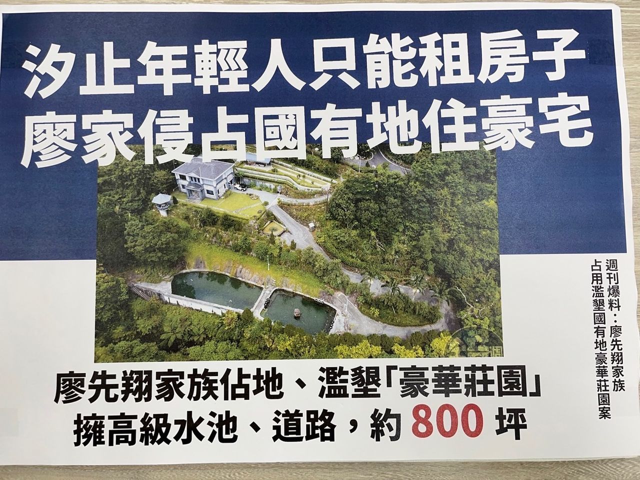 國民黨新北立委參選人、議員廖先翔今(1日)被爆與其父、涉收賄被判刑的廖正良,在保育區違法興建豪華莊園、佔用國有地蓋停車場,民進黨團表示,廖家未經申請就在山坡地保育區破壞水土保持,也沒有看到相關污水下水道設施,這麼大豪宅是在自來水取水口以上的水源保護區,侵佔國有地還逼迫汐止人喝你們排的污水。