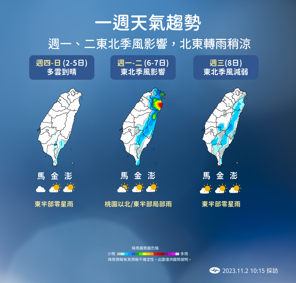 未來一周天氣分三階段變化,今日到周日各地天氣晴朗穩定,下周一、二鋒面及東北季風影響,北東降溫有雨,下周三後再恢復穩定的好天氣。其中周一晚上到周二降雨比較明顯,周二是天氣最涼的一天。