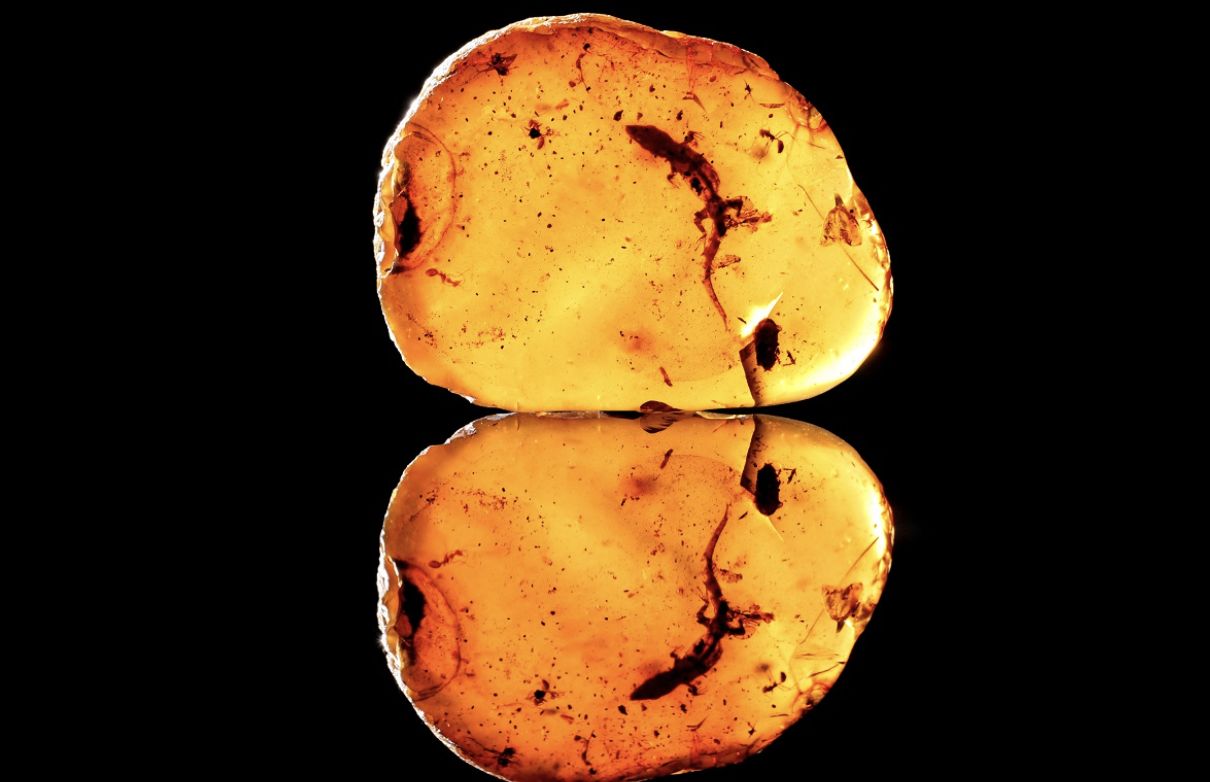 ▲白堊紀蜥蜴動態捕獵瞬間被定格在琥珀裡。(圖/翻攝澎湃新聞)