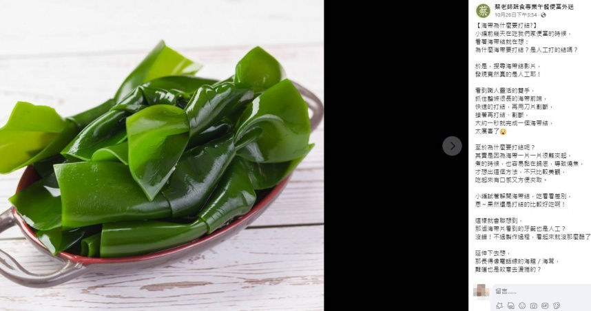 ▲專家發文解釋海帶打結的真實原因。(圖/翻攝自臉書粉專「蔡老師蔬食專業午餐便當外送」)