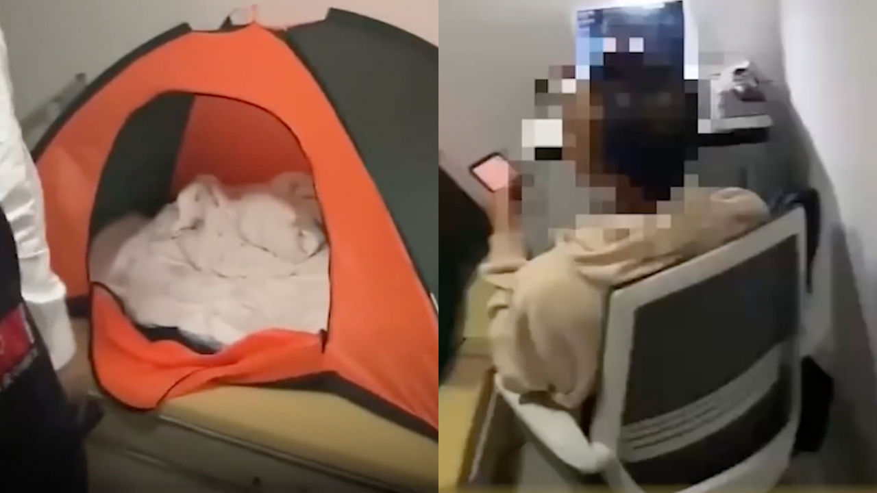 更讓人驚奇的是,這個隱秘之處被他打掃得非常乾淨。畫面顯示,在樓梯間內擺放了帳篷、床墊、筆電、電腦桌椅等。