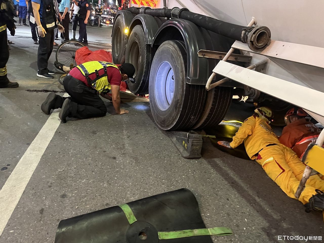 ▲屏東鹽埔鄉光復路槽車與腳踏車發生交通事故,消防隊員救援 。(圖/記者陳崑福翻攝)