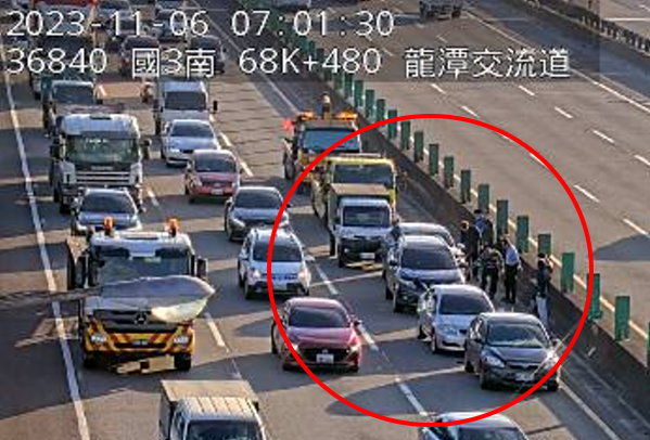 上班注意!根據警廣即時路況資訊,今天(6日)一早6時50分許,國道3號南下68.4公里、龍潭交流道路段,發生4輛自小客車、1輛小貨車追撞占用內線事故,請用路人小心駕駛。