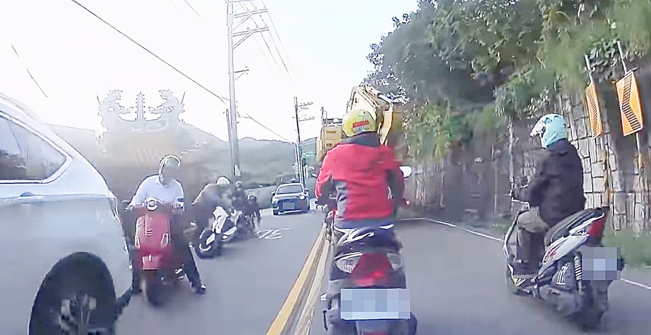 ▲網友在臉書檢舉這起發生在10月31日於桃園市龜山區兔坑路,騎士在雙黃線逆向超車,害對向3輛機車發生追撞倒地意外。(圖/翻攝自臉書《龜山生活通》)